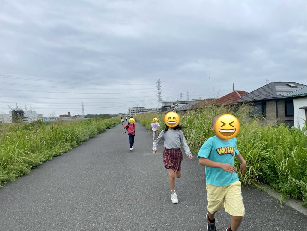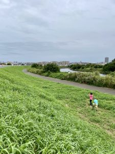 急に涼しくなった日。土手沿いは気持ちいい。子ども達はしゃぎまくりで、土手の坂を駆け上がったり、お花や虫にキャーキャー言ったり。