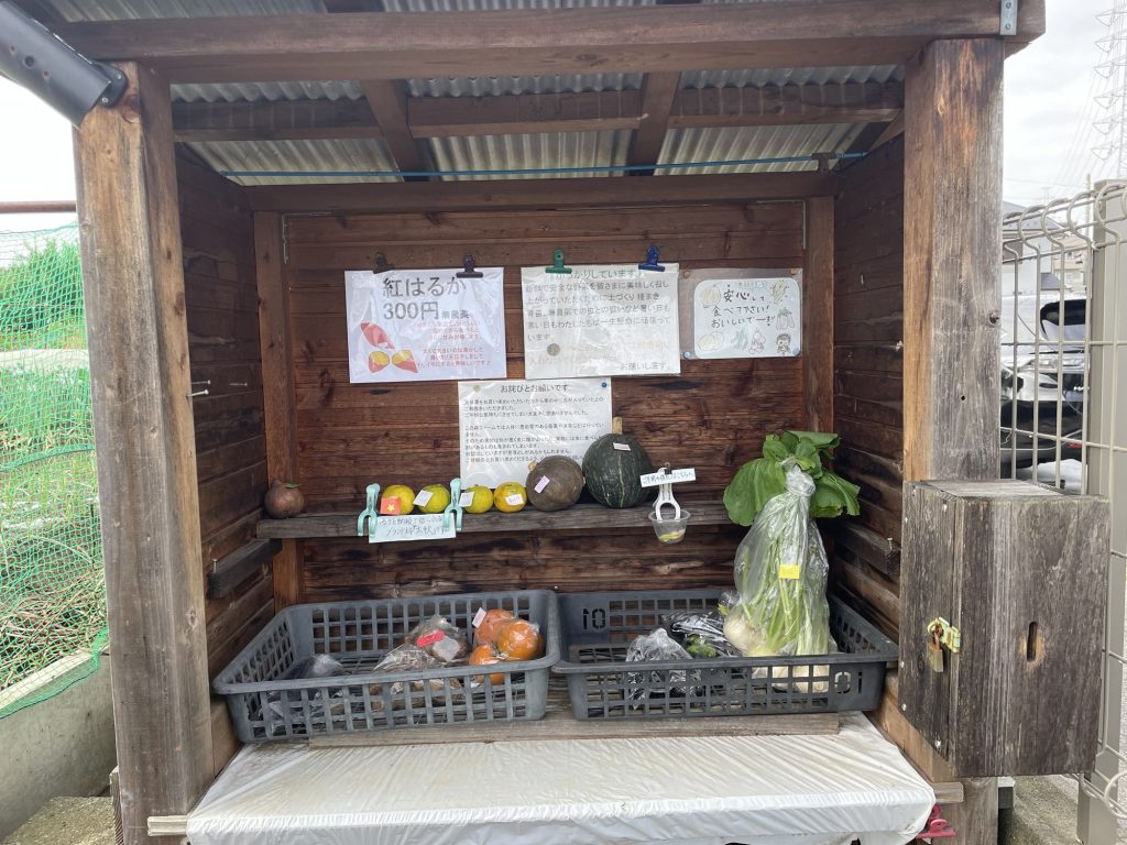 ちょっと道を間違えましたが、そのおかげで素敵な無人販売店に出会いました。子ども達がザクロを見つけて、100円で買いました。