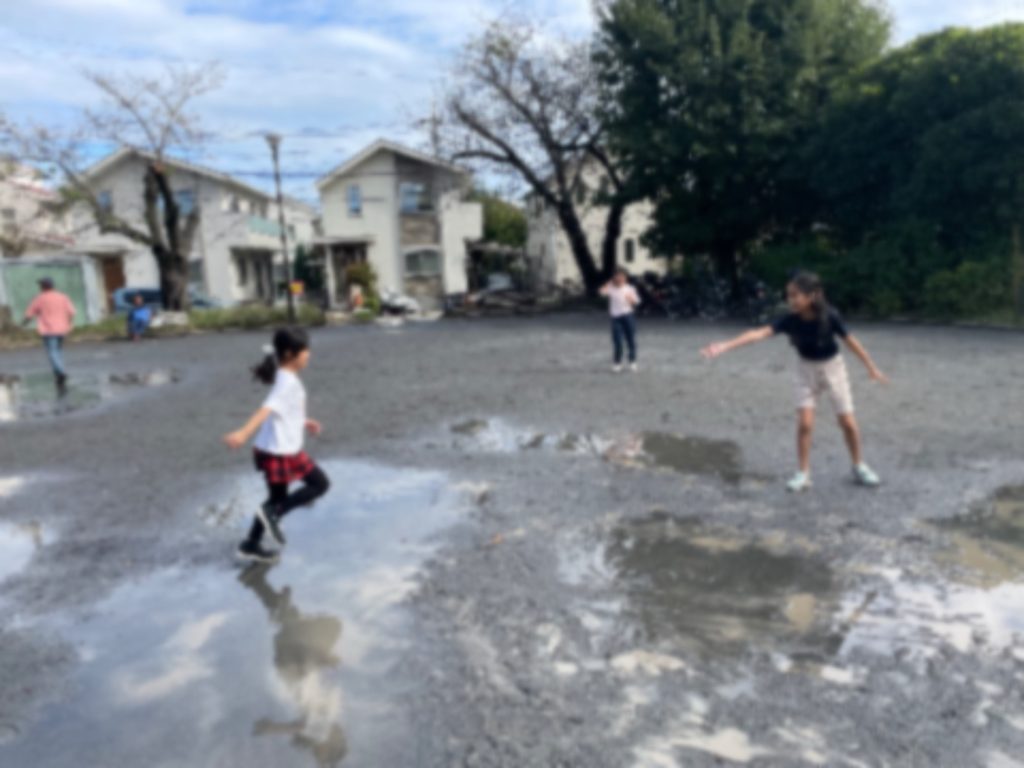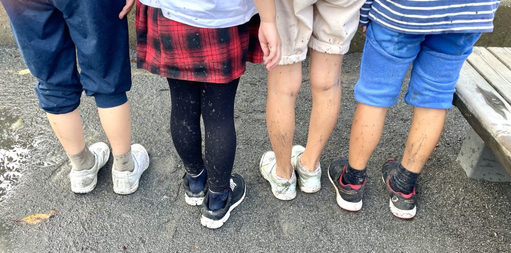 パン屋さんの近くの公園でお昼ご飯。朝まで降っていた雨のせいで、公園は水溜りだらけ。最初はアウトドア派の子が果敢に水溜まりの中に入り、1人また1人とそれに続き、最後は水溜りがあるから遊びたくないーと言っていた子まで泥だらけになって遊びました。本能なんですね、きっと。