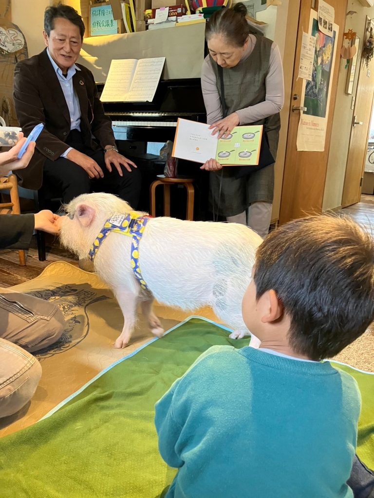 ミエルに戻ると、そこに子豚が我が物顔で歩いている…。豚のボンちゃんが遊びにきてくれていました。ミエルの地域のつながりから子豚とも交流できました。
