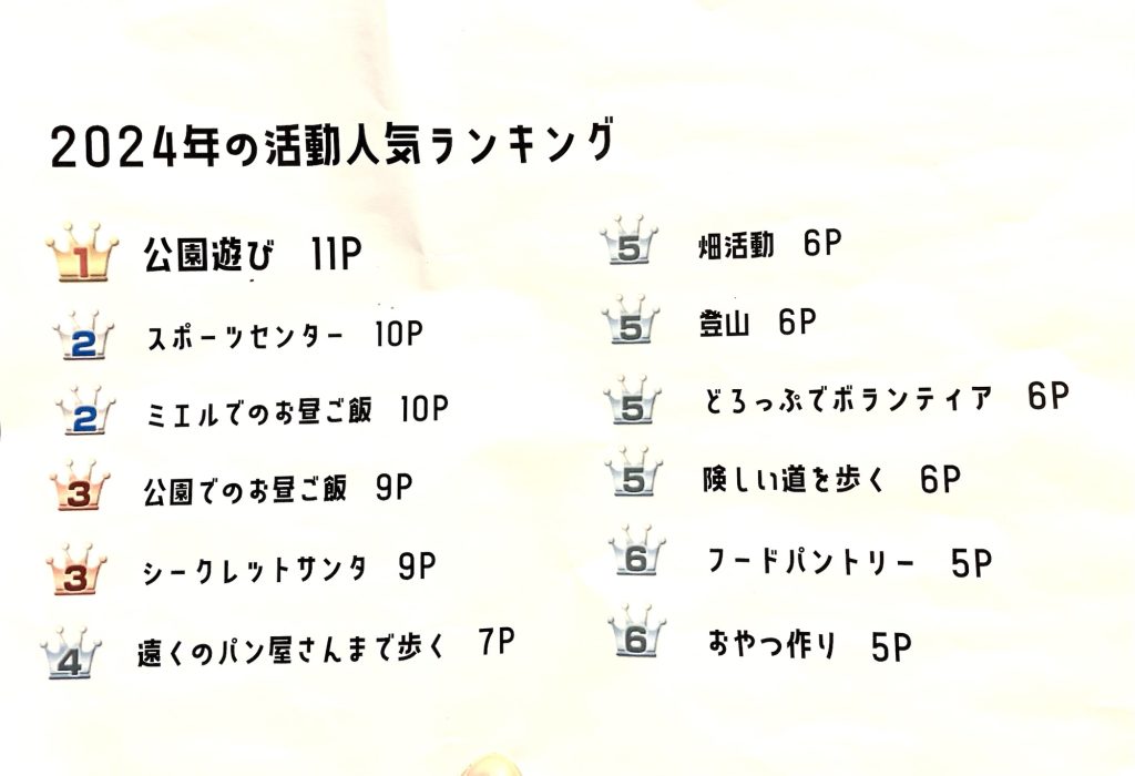 あーでもない、こーでもないと話しながら作ったじゃがりこポテトサラダを食べながら、みんなに回答してもらったアンケート結果を発表しました。はえある一番人気だった活動は…