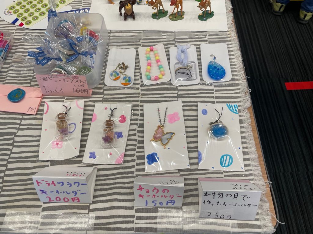 それぞれの子が持ち寄った作品も、とても個性豊かでした。イヤリング、キーホルダー、シーリングスタンプ、不思議なウニの飾りなど、昨年よりもずっとクオリティが上がっていて、手に取る人の表情も自然とほころびます。昨年は少し売れ残った品もありましたが、今年はほとんど完売。みんなの努力が形になりました。
